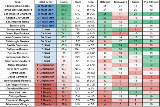 I’ll also include D/ST grades, and just like the skill-position players, there will be four criteria used for grading on a scale from 1-25, and final grades will be from 1-100. The four criteria for a D/ST grade are: Matchup, Turnovers, Sacks, and Points Allowed.