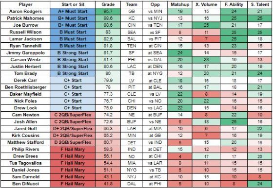 It’s easy to see that an ‘A+’ or ‘A’ grade makes a player a must-start, but it might not make sense at first glance why some players are rated ‘C’ or worse and still have ‘Start,’ ‘Strong Start,’ or ‘Flex’ attached to their names. Because of all the different variables that go into a player’s performance in any given week, only those players with the absolute highest potential, best matchup, and strongest talent get ‘A+’ or ‘A’ grades. Therefore, even solid plays will earn grades that may appear sub-optimal on the surface, but it’s all relative from position-to-position. The hard cutoff is 50 for every position, as grades lower than this will earn a ‘Desperation’ or ‘Hail Mary’ tag in every situation.