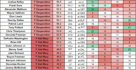 It’s easy to see that an ‘A+’ or ‘A’ grade makes a player a must-start, but it might not make sense at first glance why some players are rated ‘C’ or worse and still have ‘Start,’ ‘Strong Start,’ or ‘Flex’ attached to their names. Because of all the different variables that go into a player’s performance in any given week, only those players with the absolute highest potential, best matchup, and strongest talent get ‘A+’ or ‘A’ grades. Therefore, even solid plays will earn grades that may appear sub-optimal on the surface, but it’s all relative from position-to-position. The hard cutoff is 50 for every position, as grades lower than this will earn a ‘Desperation’ or ‘Hail Mary’ tag in every situation.