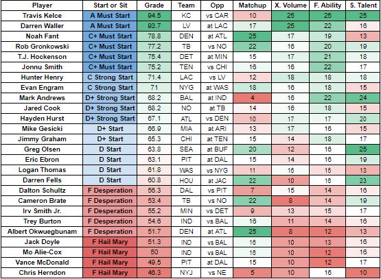 Not too many surprises here. Travis Kelce will remain the TE1 every week he’s on the field. The rest of the top-5 consist of studs with strong matchups, Jonnu Smith falls out of the top-5, and Mark Andrews is our ninth-highest graded TE as he faces the league’s stingiest defense to the position.