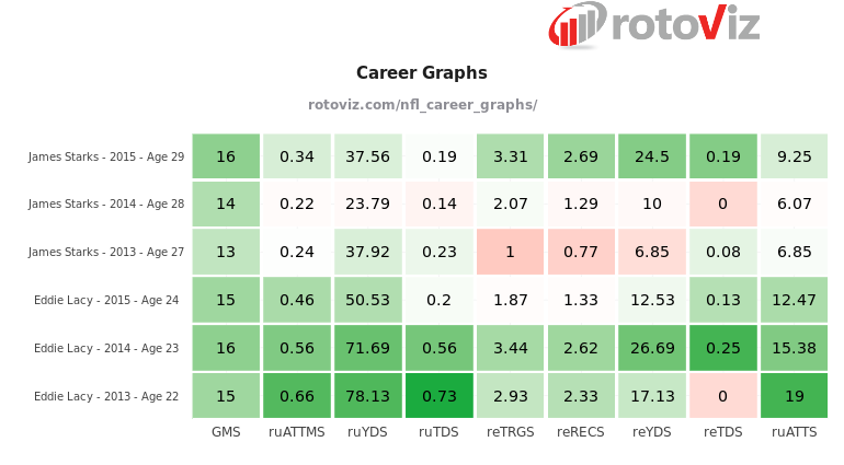 The offense should get back on track with the return of Jordy Nelson and a healthy Randall Cobb. Here is a visual using data from the RotoViz NFL Drive App to display how tremendous the Packers offense has been since Lacy’s rookie season in 2013.