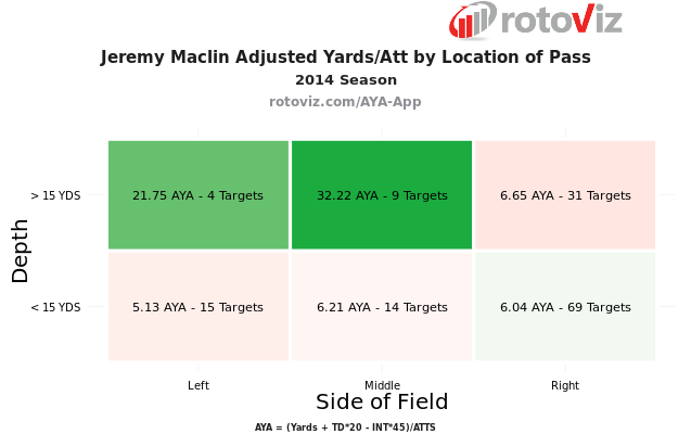 Both players had 80 or more receptions and greater than 1,300 receiving yards in Kelly’s offense. Smith is known for his very good play speed and the scheme is designed to attack defenses vertically. Here is a visual of how what Maclin’s adjusted yards per attempt looked like in Kelly’s scheme back in 2014.