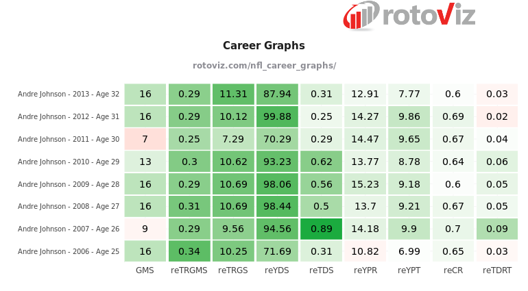 Former Texans wide receiver Andre Johnson built the foundation of his career in this offensive scheme. Here is a visual of what Johnson did statistically with Kubiak in Houston from 2006 to 2013.
