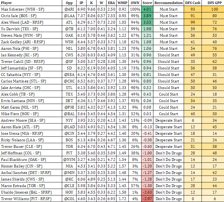 DFS Cash – Not based on value, but performance only. Heavily favors ratios and odds at getting the win and quality start