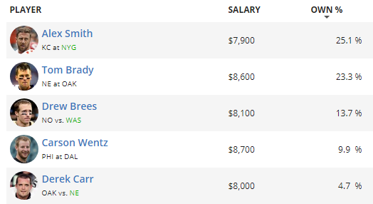 There are a handful of solid options this week in both cash games and GPP. This list has to start with Alex Smith, who has at least 15 fantasy points in every game and has a terrific matchup against a shoddy Giants defense. Tom Brady has also been exceptionally consistent and has an excellent matchup against the Raiders in what could be a shootout. Picking between them and some of the others may be difficult, but I’d advise you to build the rest of your lineup first then let the tiebreaker be who fits best into your remaining budget.