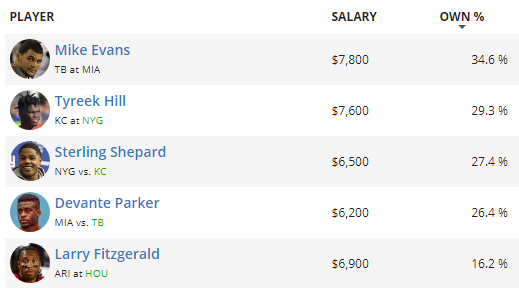 Almost unbelievably, we project 11 players to have at least 10% ownership this week at wide receiver. That is in no way typical and it tells us that there are no must-plays and plenty of quality options. Tyreek Hill is a great play in GPP contests, but using him in cash games is a daring move. If you are using cash games, I’d avoid him and focus on the players who are sure bets to see 8+ targets in good matchups like Mike Evans, Michael Thomas and Devante Parker, who very rarely bust and all have major upside this week.