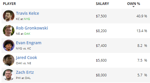 You may be caught up entirely in Travis Kelce, and for good reason, and his matchup against the Giants might make him the best play of the year, but don’t forget about four other players who are all also great plays. The list starts with Rob Gronkowski who gets a lousy Raiders tight end defense. Evan Engram is still a solid price and is getting too much volume to ignore, then there are Jared Cook, who has been blazing, and Cameron Brate, who has another top-notch matchup against the Dolphins. It is hard to go wrong at the position this week.