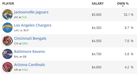 You can play games if you want and risk your lineup on Cincinnati or the Chargers’ mediocre defense against crummy quarterbacks, but you will be fading obvious chalk, as Jacksonville has the top projected fantasy points of the season at the position. Not only is Deshone Kizer the worst quarterback in the NFL and the Jags the top defense in maybe two decades, but they will be playing in heavy wind and some snow.