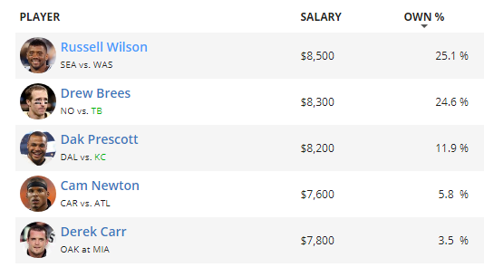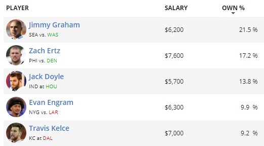 We aren’t exactly seeing vintage Jimmy Graham, but he does have 4 touchdowns in his last three games and is coming into a terrific matchup at home against the Redskins. For that reason and his price, he will likely be the highest owned, but with the dominant Zach Ertz, who is also in a solid matchup, right behind him despite the lofty price point. Jack Doyle rounds out the top three as a superb value play coming off a 12 reception game last weekend.