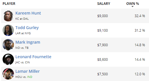 There isn’t much in the way of safety this week with Deshaun Watson out, which would usually mean ownership would be spread around quite a bit more than it is. The reason three players are projected for over 60% of the action is that there are so many crummy matchups this week for the second tier of quarterbacks. Don’t play it too cute in cash games. Rather, make sure to get your hand on one of these three.