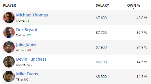 We’ll be able to afford spending up at the running back position this week because the four top plays in our model are all under $8,000. Julio Jones isn’t necessarily safe, and will see the majority of his ownership in GPP contests, but Michael Thomas and Dez Bryant should both see above 50% ownership in cash games with strong matchups and a large expected target share. If you need to get your hands on some serious value, Devin Funchess should take over as the #1wide receiver for Cam Newton this week in what may turn into another shootout.