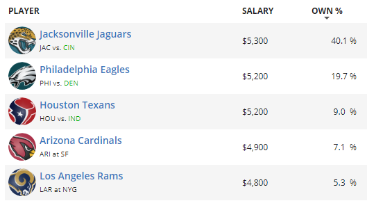 In cash games, expect to see Jacksonville at near 70% ownership. If you ask me, that is too low because there is no sense in considering anyone else for cash games as the Jags should pile up 5+ sacks and multiple interceptions against the shoddy Bengals’ offensive line. For GPP contests, the Jags are, of course, a solid play, but there are several others who stand out as tantalizing options like the Cardinals against C.J. Beathard and Philly against Brock Osweiler.