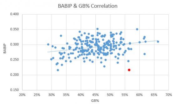 Let’s take a look at the correlation between GB% and BABIP to understand if this is a contributing factor to Chatwood’s road success or determine if we need to regress those road stats to get a more solid projection for 2018. Again, I looked at single-season BABIPs and GB% for every starting pitcher with at least 150IP.