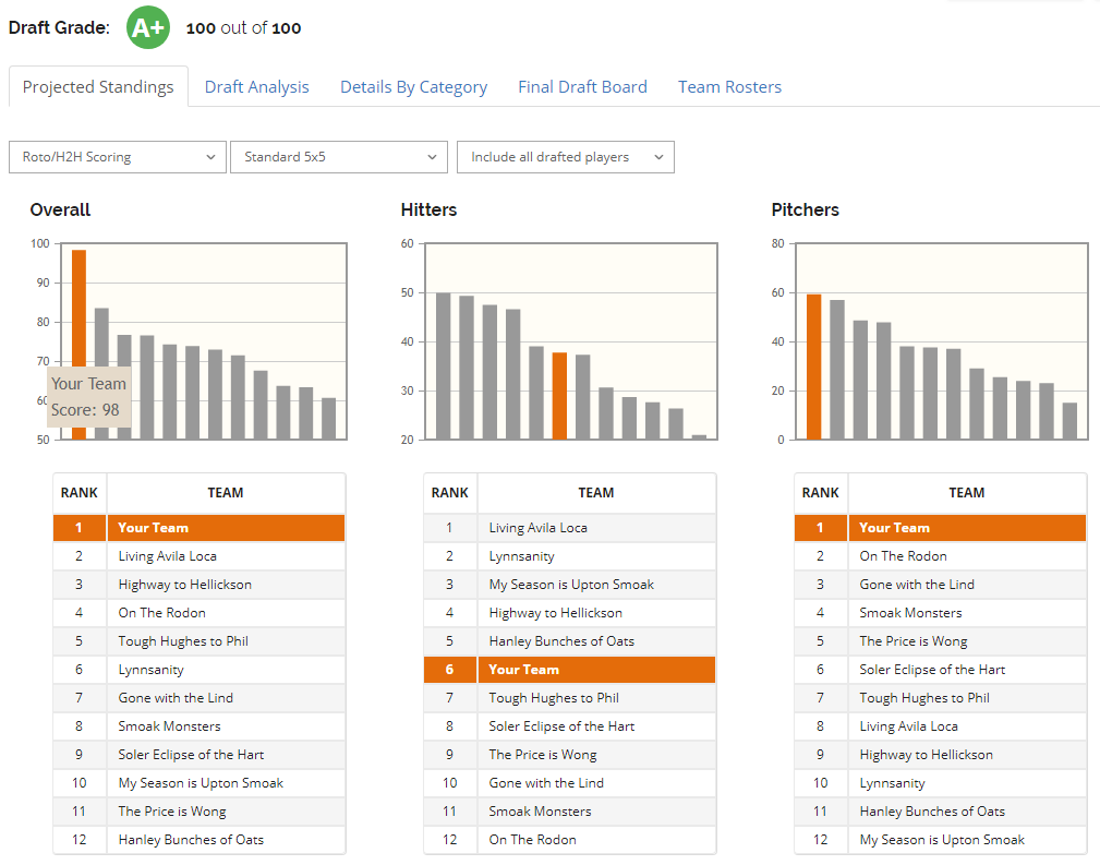 As you can see, it went quite well. My power hitters are a force to be reckoned with and my rotation practically guarantees I win at least 4 categories every week. While I don’t have quite as much confidence in this strategy as the near-certain championship the Marmol Strategy offers, I am more than comfortable letting this one play itself out if the first few rounds fall into place like this one did. In fantasy baseball, like anything else in life, you can’t fit a square peg into a round hole, so make sure you use our free Draft Simulation Software to prepare for every potential situation.
