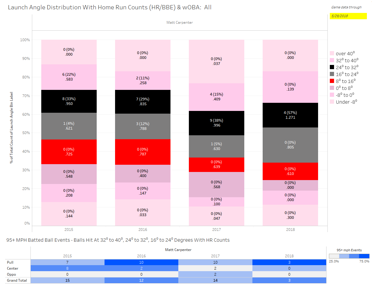 Matt Carpenter (3B – STL) is running the same ISO as usual (.215+) but his batting average has been low to start the year despite holding a ~.274 BABIP since the start of the 2017 season. So what’s going on with Carpenter and why has his BABIP been so low since the start of 2017?