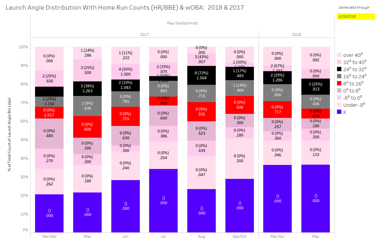 All of these things combined are why you see what you see with Goldschmidt in 2018. Remember that he’s not a .300 hitter with the humidor in place – that’s not a given anymore, it will take luck. But if you need a batting average and/or on-base percentage boost for the rest of the season, there’s almost no way Goldschmidt won’t hit .300/.375 for the remainder of the season. Just don’t plan on getting 25-30 HRs with it, he’ll likely get around 15-20. Remember, Goldschmidt doesn’t hit that many flyballs (~32%) so he relies on elite contact and previously his favorable home park conditions to run his HR totals up.