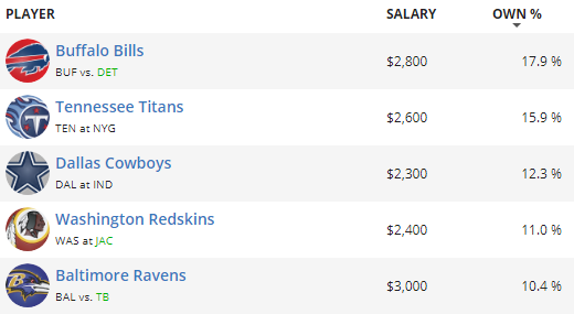 Like almost every other week, we are expecting almost every lineup to find a cheap option under $3,000 at D/ST in Week 15. The most common plays will be two talented defenses, Buffalo and Tennessee, who happen to be in plus matchups versus the Lions and Giants respectively. Not too far behind, however, we’ve got Dallas (@ IND), Washington (@ JAX) and Baltimore (vs TB) all in double-digit projected ownership. Good luck this week!