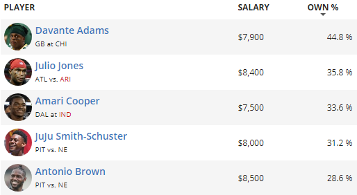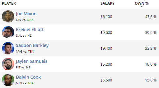 Nearly everyone will be on at least one, and perhaps all three of the top trio on this list. Joe Mixon leads the way with an excellent salary and an even better matchup versus Oakland. Right behind him, we are forecasting nearly 40% to use Ezekiel Elliott as a result of his heavy usage in the passing game lately. Saquon Barkley comes in third despite the hefty price tag, then you’ve got to drop all the way down to under 20% for the final two on the leaderboard. We’ve got Jaylen Samuels getting some love as the top value option at the position and Dalvin Cook as a popular mid-range play versus the Dolphins.