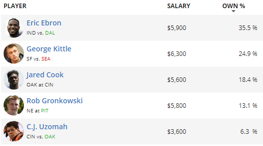 Unlike most weeks, there is only one value option on our leaderboard. C.J. Uzomah gets the best possible matchup for tight ends, but he comes in fifth on the list because you can’t beat the reliability of targets. Each of the top four offer plenty of that with Eric Ebron the favorite. T.Y. Hilton is banged up so Ebron could see double-digit targets once again. George Kittle looks to add on to last week’s huge performance with a great Week 15 game versus the Seahawks. Then under 20%, we’ve got Jared Cook (@ CIN) and Rob Gronkowski (@ PIT).