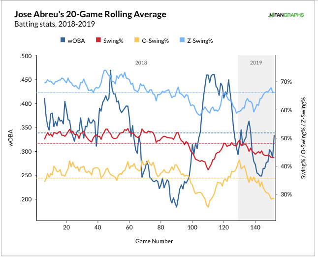Owners may not be ecstatic about Abreu’s start to 2019, but he hit .571 (12-for-21) with two home runs and a whopping 12 RBIs last week. He’s a notorious slow starter, as evidenced by his career 124 wRC+ in the first half compared to a 148 wRC+ in the second half. But there are some positive signs from Abreu early this season. He’s changed his approach and is now more patient at the plate.