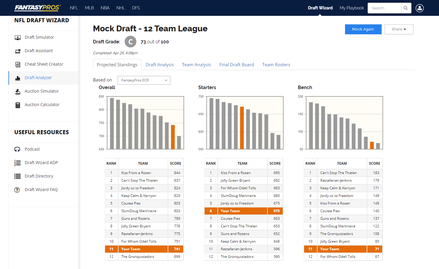 Here are the results of my most recent mock, and while I received a ‘C’ grade, I believe my team is much better than that. The grade is based on projected points and performance against other teams, and some of the rookies I selected haven’t been accurately projected yet. I have confidence in N’Keal Harry and D.K. Metcalf, who should be featured prominently on their respective offenses, and Noah Fant should be a target monster for Joe Flacco in Denver.