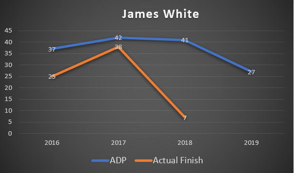 One of the riskier options on this list is White. The amount of variance he displays in his actual finish is a bit scary. Couple this with the fact that the Patriots have had three different running backs finish better than RB15 in each of the last three years (LeGarrette Blount – RB9, Dion Lewis – RB13, James White – RB7) and it’s quite difficult to predict. One interesting point is that both Blount and Lewis went on to different teams after these top performing seasons. White has the rare opportunity to repeat because he’s still with them fresh off his best season.