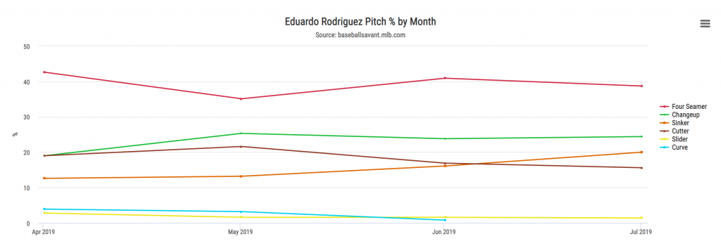 Rodriguez is still a four-seam fastball pitcher first, but he has relied more on his secondary offerings as the season progresses.