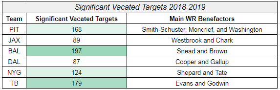 There we have it, at least a few players on this list could see a large increase in targets coming their way in 2019. Let’s break it down by teams’ significant available targets.