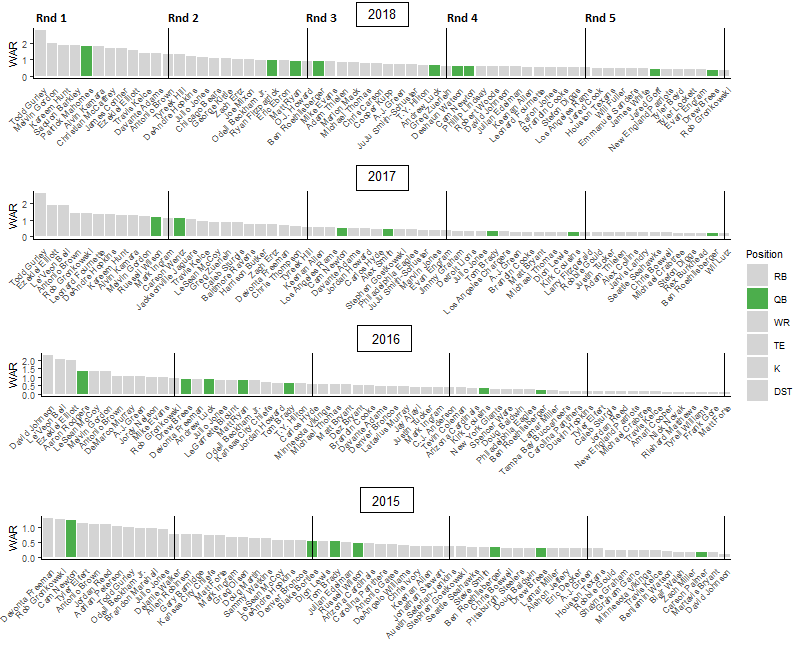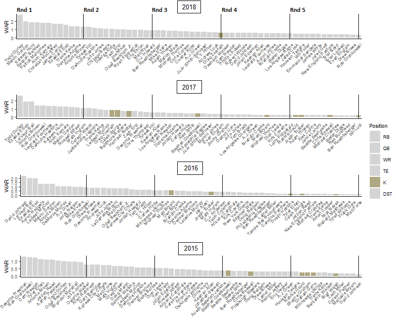Above are all running back WAR results for the first five rounds of the last four years. The picks are in sequential order from left to right with running back highlighted blue and all other positions grayed out.
