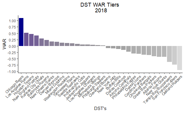 The only relevant DST worth focusing on is the Chicago Bears, worth almost three full rounds ahead of the runner-up Los Angeles Rams. This visual above doesn’t quite pay their dominance justice. The following graph shows their 2018 WAR was more than twice that of the Rams and in a league of their own compared to the rest of the NFL: