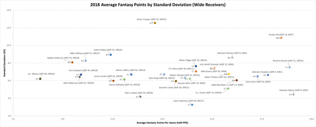 In this analysis, we examined the top-30 wide receivers being drafted and how consistently they produced their average fantasy points (FPTS) per game last season in half-PPR scoring.