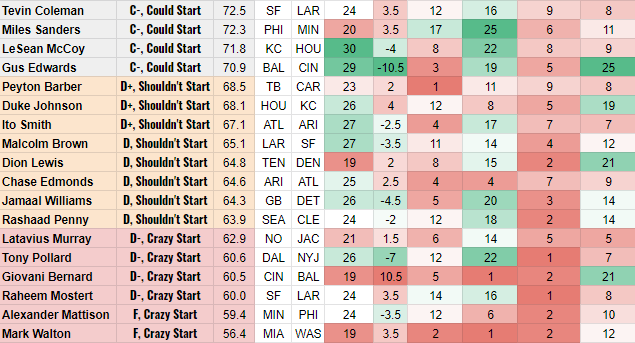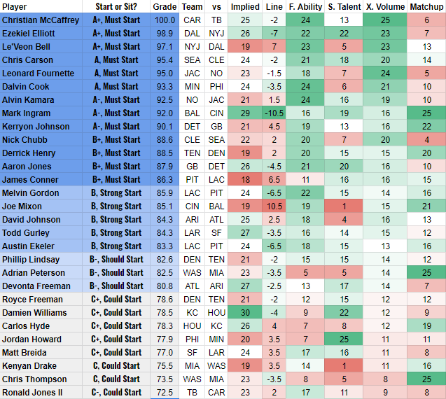 Happy Friday everyone! Another Patriots blowout is behind us which means it is time to look ahead to the full slate of games and make start/sit decisions. This article is for those of you who would love to sit down and read a detailed start/sit article for 90 minutes but just can’t carve out the time at this stage in your life. Instead, I’ll give you all the information without any of the words. Here is how it works: it’s quick-hitting advice with an overall grade and start/sit recommendation for every fantasy-relevant player based on four simple criteria: Matchup, expected volume, fantasy ability and surrounding talent.