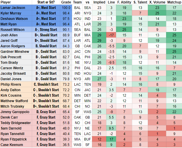 Happy Friday everyone! Thursday night’s football game is behind us and while we wait on the news about Patrick Mahomes, it is time to look ahead to the full slate of games and make start/sit decisions. This article is for those of you who would love to sit down and read a detailed start/sit article for 90 minutes but just can’t carve out the time at this stage in your life. Instead, I’ll give you all the information without any of the words. Here is how it works: it’s quick-hitting advice with an overall grade and start/sit recommendation for every fantasy-relevant player based on four simple criteria: Matchup, expected volume, fantasy ability and surrounding talent.