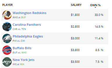 Yeah, so the Redskins’ defense is super cheap this week. But do you want to take them? Washington will start Dwayne Haskins on Sunday, so I’d look for them to deal with some negative game script. That said, I guess there’s always a chance that one of Josh Allen’s passes gets intercepted. Jacob Herlin doesn’t hate Washington this week, either, so they’ve got that going for them. The other defenses should be more reasonably owned. Carolina’s got a rock-solid matchup against Ryan Tannehill and the Titans, and although they’ve looked better with him under center, they aren’t a particularly high-powered team. The Eagles have a date with Mitch Trubisky and the Bears, and they’ve finally gotten all of their cornerbacks healthy. We’ll see if they can start playing defense against the pass. The Bills and the Jets round out this week’s list, and both have juicy matchups (and appropriately high salaries). I’d take the Bills over the Jets this week just because rookie Dwayne Haskins seems more exploitable than the grizzled Ryan Fitzpatrick.
