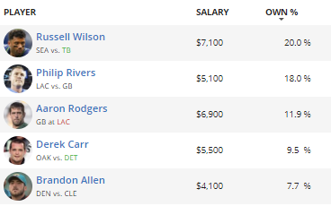 Russel Wilson against Tampa Bay and Philip Rivers against Green Bay should be two of the most popular picks this week, as they both should be getting taken at clips above 15%. Russ tops the charts on Paul Ghiglieri’s QB1 Primer this week, so I’m not surprised that DFS users are high on him too. The Buccaneers’ defense creates a perfect storm for Seattle’s passing game — Tampa Bay can stop the run, but they cannot stop the pass. Meanwhile, Rivers squares up with the solid Green Bay passing defense. The Packers give up an eighth-lowest 16.3 DraftKings points per game to quarterbacks, but Rivers’ bargain-bin price might be driving his popularity. I’m cautiously optimistic that Ken Whisenhunt’s firing will help Rivers out, but I’d prefer to take a wait-and-see approach. His opponent, Aaron Rodgers, should also be a popular pick. The Chargers’ defense hasn’t been great this year, so I expect the Packers to take advantage of their banged-up front seven and run the ball this week. Derek Carr is an excellent choice if you’re looking for a cheap option at quarterback, as he takes on a Detriot secondary that’s without Quandre Diggs. They could even be missing Darius Slay come Sunday, and the Lions already give up the sixth-most DraftKings points per game to quarterbacks at 23.4. Brandon Allen rounds out the list, and while he makes sense as a tournament play flyer, I’m not sure there are enough weapons for him to work with in Denver.