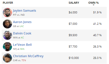 With James Conner and Benny Snell unlikely to play on Sunday, it’s a no-brainer why Jaylen Samuels should be owned in over half of DraftKings lineups. He takes on the Colts, who have been decent against running backs. They give up just 21.3 DraftKings points per game to the position, seventh-fewest in the league. With a price of only $4,000, I think Samuels might have to be chalk this week. I love Aaron Jones against the Chargers, as they’ll be without three of their defensive linemen once again this week. They’ve given up monster games to Derrick Henry and David Montgomery without them, so look for Jones and Jamaal Williams ($5,900, 0.1% projected ownership) to capitalize. You can’t go wrong with Dalvin Cook this year, and his high ownership rate reflects that fact. Like the Chargers, the Chiefs could be without two key pieces of their defensive line, so look for the Vikings to exploit that matchup. Le’Veon Bell and Christian McCaffrey round out the list; while Bell is here because of his juicy matchup, McCaffrey might just be matchup-proof. Look for Bell to explode in Adam Gase’s revenge game, while McCaffrey should put up numbers similar to what he’s done all season.