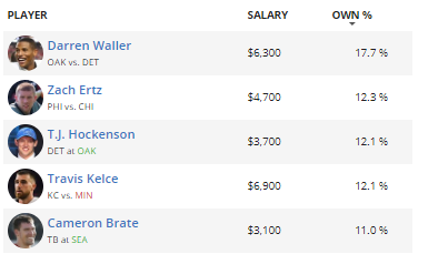 Ownership rates should be pretty evenly distributed at tight end this week. Without George Kittle on the slate, and with Travis Kelce’s upside limited by Patrick Mahomes’ injury, I guess it makes some sense. Darren Waller should be a candidate for a huge day against Detroit’s putrid secondary, while T.J. Hockenson could recapture his Week 1 magic against Oakland’s equally lousy unit. I’m a little surprised to see Zach Ertz here given the impending return of DeSean Jackson and Dallas Goedert’s emergence. I wouldn’t pick Ertz in any lineup, to be honest. Travis Kelce should be a reliable option with or without Patrick Mahomes to throw him the ball, and the Vikings’ defense hasn’t been anything special against tight ends. Cameron Brate rounds out the list as the obligatory dart throw, and I like his chances against the Seahawks’ defense that gives up a fourth-highest 16.5 DraftKings points per game to tight ends. Although he’s a bit more expensive, Jonnu Smith ($3,800, 7.5% projected ownership) is another strong play with Delanie Walker out once again.