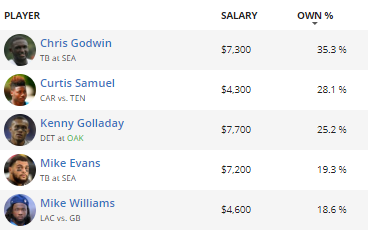 Is it a Chris Godwin or a Mike Evans week? Most DraftKings players want Godwin, even though he’s $100 more than Evans. Godwin has been the more consistent of the two, but he showed that he, too, can bottom out when he caught just four passes for 43 yards last week. The Seahawks are a mid-pack defense against wide receivers, but Jameis Winston’s arm should carry at least one of Godwin or Evans to solid fantasy numbers. My take? Godwin for cash games, Evans for tournaments. Godwin’s your guy for floor because he has been targeted at least eight times in all but two games. Evans, meanwhile, carries ceiling without much floor. Curtis Samuel is questionable for Sunday’s game against the Titans, so you should make sure that he’s playing before committing to him on Sunday. Kenny Golladay is somehow our only representative from the Oakland/Detriot game, which is sure to be a high-scoring shootout. I’d expect Golladay, Marvin Jones ($6,000, 8.7% projected ownership), and Tyrell Williams ($5,900, 13% projected ownership) to be solid WR1 candidates this week. Both secondaries are roastable. Lastly, we’ve got Mike Williams against the Packers. Again, I’d like to wait and see with the Chargers’ offense post-Whisenhunt, but to each their own. That said, his cheap $4,600 salary does have some appeal.