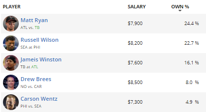 Matt Ryan takes on the Buccaneers, and he’s a strong bet against their second-worst defense against quarterbacks. They are surrendering a whopping 23.7 FanDuel points per game to the position, ensuring that Ryan will have a strong floor this week. Even though he’ll be without Austin Hooper and Devonta Freeman, last week proved that Atlanta could win without them. It’s no surprise that a quarter of FanDuel players are expected to slot Ryan into their lineups, but he’s not quite chalk, and there are some strong plays elsewhere. After Ryan, we’ve got two popular picks above 15% projected ownership. Russell Wilson is the first of these guys. He’s having an MVP-caliber season, and he’s got the Eagles this week. However, Philadelphia has improved defensively in recent weeks. Since Week 8, the Eagles have only given up 44 points, or 14.667 points per game. They’ve done it against some decent teams, too, as they played the Bills, Bears, and Patriots over that span. Although I’m confident in Russ as a quarterback, I don’t know if the matchup justifies his $8,200 salary. The Eagles’ passing defense is even in the top half against opposing quarterbacks. Jameis Winston comes in next against a recovering Atlanta team. While I expect that he’ll rebound from his bad showing against New Orleans last week, I’m also unsure if I’d want to roll the dice on him when Ryan is just $300 more. The argument for Winston is that his receivers are elite and can make plays despite him, but his interceptions will cost you fantasy points, and the Falcons got four of them last week. We wind out the list with two guys under 10%. First, we’ve got Drew Brees against the Panthers. Unlike the Eagles, the Panthers have been cold lately. The Falcons throttled them last week, and I’d look for the Saints to do the same here. While Carolina has been decent against opposing quarterbacks this season, as they have only given up 15.8 FanDuel points per game to the position, they’ll need Kyle Allen and the offense to maintain possession, and I’m not sure if that’ll happen. Finally, Carson Wentz takes on the Seahawks’ weak passing defense. The “Legion of Boom” is long dead, and Seattle is currently giving up a 14th-highest 18.8 FanDuel points per game to quarterbacks. While Alshon Jeffery and Nelson Agholor might be beaten up, Wentz still has his tight ends. I think he’s a smart value option.