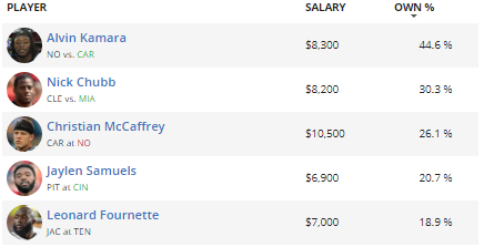 Alvin Kamara hasn’t had a great season, but his frequent usage in the passing game gives him some decent value in FanDuel’s Half PPR format. Kamara has 20 targets and 18 receptions the last two weeks alone, so it’s not surprising that FanDuel users are projected to be heavily invested in the Saints’ lead back. He’s even got an easy matchup, as the Panthers give up a third-worst 26.1 FanDuel points per game to the position. His 44.6% projected ownership is pretty close to chalk, and I’d recommend buying him in cash leagues. I’m also not surprised to see Nick Chubb on here against the Miami Dolphins, as Brian Flores’ team has struggled this year — or maybe they’re just tanking. Regardless, Miami gives up the seventh-most FanDuel points per game to running backs. Although they’ve only played 10 games, they’ve given up more rushing yards than all but one of the teams that have played 11. It’s worth noting that they’re far worse against running backs on the ground than they are through the air. Though they’ve given up the second-most rushing yards to running backs, they’ve given up the tenth-fewest yards to them through the air. I suspect that this is because teams are keeping the ball on the ground to run out the clock. Why am I saying this? Easy, so that you don’t let Kareem Hunt ($5,600, 5.4%) scare you off of buying Chubb. Next up should be Christian McCaffrey, and I think that last week proved that he’s worth his salary even with a negative game script. The man is the definition of a known commodity. We’ve got one of the Pittsburgh running backs up next. Jaylen Samuels is a pass-catching specialist, which gives him a solid floor. Consider buying Benny Snell ($4,500, 0.0% projected ownership) with James Conner out of the lineup. Both backs should have big days as the Steelers run out the clock against Cincinnati. Lastly, we’ve got Leonard Fournette. The Titans are a mid-pack defense against running backs, and Fournette had a decent day against them his last time out. He earned 66 yards on 15 carries, and he added 26 yards on six receptions. He’s a solid floor play with a surprisingly affordable price this week.