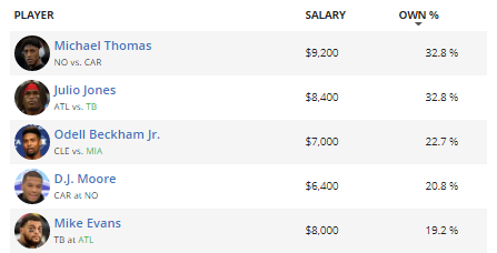 I led off last week’s wide receiver section with stats about Michael Thomas’ crazy 2019. I’m glad I get to do that again. Through ten games, Thomas has earned 190.2 Half PPR points — good for 19 per game. He’d currently be last year’s WR16 through just ten games. If he keeps up his current pace, he’ll finish the season with 304 Half PPR points, which is 19.5 more points than last year’s WR1. So long story short, what Christian McCaffrey offers you at running back, Thomas offers you at wide receiver. Unsurprisingly, he’s got the highest rate of ownership of anyone on this list, and while the Panthers’ run-funnel defense may limit his upside, the Saints are just as likely to beat the Panthers through the air, as Carolina’s secondary got exposed last week by the Falcons. Speaking of the Falcons, Julio Jones is projected as the second-most owned wide receiver this week. If there were ever a team to start your wideouts against, it’s Tampa Bay. They give up the most points per game to the position at 39.2, which is 4.9 more than the second-worst team. He’s as much of sure thing to finish as a WR1 as we’ve got. Odell Beckham Jr. is projected as another popular pick. Beckham and the Browns have struggled this season, but the Dolphins give them an opportunity to get right. Beckham’s low-end $7,000 is worth it, as the receiver has dominated the Browns’ target share of late. He’s earned double-digit targets in both of his last two games. D.J. Moore slots in fourth against the Saints, and he’s been hot despite Kyle Allen’s poor play. Moore has had double-digit targets in three of his last four games, and while he hasn’t scored in that span, his volume means that he has somewhat of a steady floor in Half PPR formats. Mike Evans finishes up our list against Atlanta, and while the Falcons have looked good lately, they’re still giving up the sixth-most FanDuel points to wide receivers. The Falcons/Buccaneers match could easily turn into a pass-heavy shootout, and Evans would be a big beneficiary.