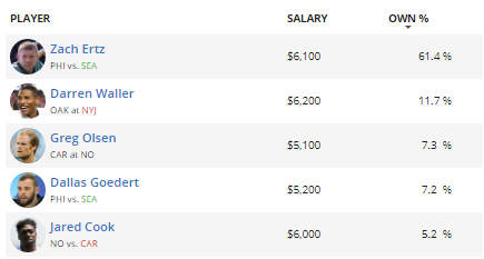 If you read this column last week, you would have seen me call Zach Ertz’s solid production. He’s chalk this week as the Eagles’ receivers continue to get healthy, so you should start him in cash leagues. The Eagles’ other tight end, Dallas Goedert, is also projected to be a popular pick. Unfortunately, his salary isn’t quite cheap enough to justify taking a risk on him, as he’s somewhat touchdown-dependent. They’ve both got a good matchup, as Seattle has struggled against tight ends this season. They are giving up 11.3 FanDuel points per game to the position, seventh-most in the league. Next up is Darren Waller, whose Oakland Raiders take on the Jets. The Jets are somehow a top-four defense against opposing tight ends, as they give up only 7.2 FanDuel points per game to the position. That said, three of the four AFC East teams are in the top eight, so it might just be because there’s an absence of talent at the position. Still, pick Ertz over Waller. Lastly, some FanDuel owners are high on two NFC South tight ends, Greg Olsen and Jared Cook. Olsen is a better value than Cook, so if you’re looking to save cap space, he could be a viable option. He’s had an up-and-down season with Kyle Allen under center, and he may rely on a touchdown to save his fantasy day. Cook, meanwhile, is just $100 cheaper than Ertz. Picking between the two, I’d take Ertz every time.