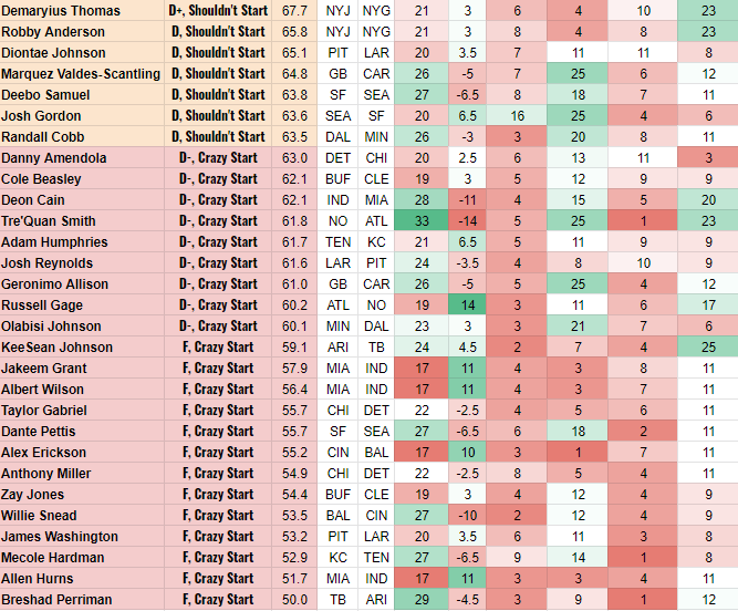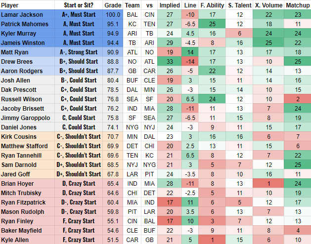 The grades listed below range from 1 to 25 with overall grades made to mimic a school grade (1-100 with letter grades). The four grades will not add up to the overall grade since each position weights the four criteria differently. For instance, volume is king for running backs, but matchups are much more important for quarterbacks. The start/sit recommendations are for 12-team half-PPR, 1-QB leagues. Slight adjustments would be made for moderate rules changes. Additionally, I’ll name a start of the week, stream of the week and fade of the week at each position. Obviously the #1 player from each player is the top start so rather, start of the week refers to a player you wouldn’t always start. Stream of the week is a player you can typically pick up off the waivers if you are desperate for a fill-in so don’t be surprised if they are down at the bottom of a table since most useful players are already rostered. Fade of the week is the opposite of start of the week, as it is a player you would typically start, but shouldn’t this week because of matchup or game script. Because the tables are a screenshot of an excel table, I’ve added a quick search/find list at the bottom of the article in case you are looking for one or two immediate answers. If you have any questions, don’t hesitate to reach out to me on Twitter @BobbyFantasyPro.