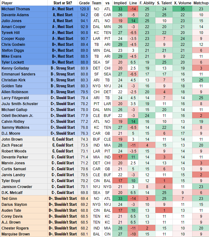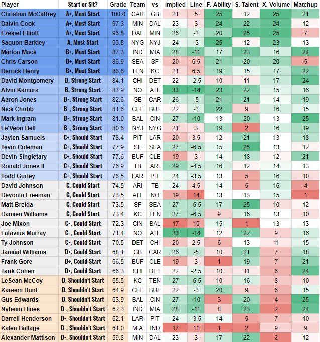 Happy Friday everyone! The Chargers just lost another close game on Thursday Night Football which means it is now time to look ahead to the full slate of games and make start/sit decisions. This article is for those of you who would love to sit down and read a detailed start/sit article for 90 minutes but just can’t carve out the time at this stage in your life. Instead, I’ll give you all the information without any of the words. Here is how it works: it’s quick-hitting advice with an overall grade and start/sit recommendation for every fantasy-relevant player based on four simple criteria: Matchup, expected volume, fantasy ability and surrounding talent.