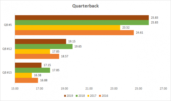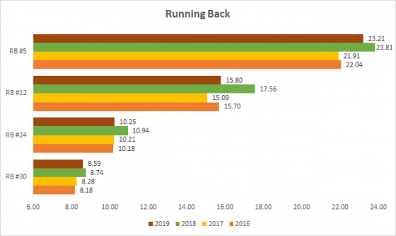 In what might have felt like a down year for QBs based on the drop in production from Aaron Rodgers, the loss of Andrew Luck to start the season, and the many backup QBs that were forced into duty, on a weekly basis the position held it’s own. When looking at 2016-2018, the 2018 season provided a nice increase in average points from the #5 and #12 QBs. While 2019 saw a slight decrease from the #12 QB on a weekly basis, dropping 2.58% compared to 2018, the #5 QB matched the 2018 numbers.