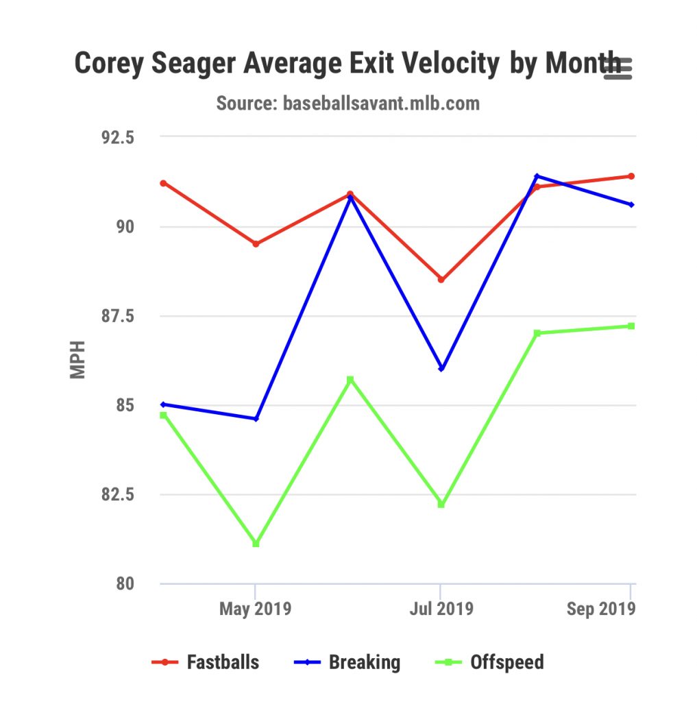 Take a look at the season-long improvement in exit velocity in tandem with his new power approach at the plate. It’s very possible that most 2020 projections and rankings may be overlooking Seager’s value.
