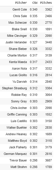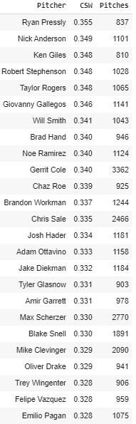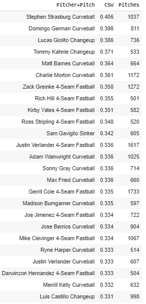 We can use the Statcast pitch-by-pitch data to isolate every individual pitch for this study. Here are the best 25 pitch offerings last year by this CSW metric.