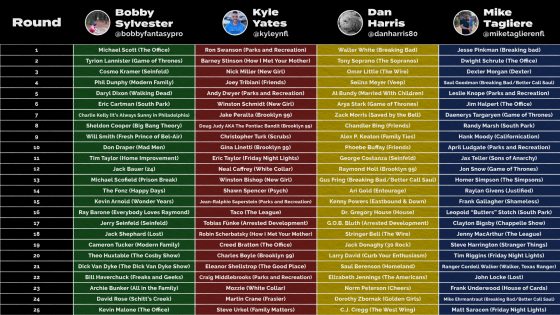 If I had to pick one, it’d probably be Dexter Morgan in the third round. Not because he’s not high on my board – he is – but because none of the other guys minded that I took him and hadn’t seen the show. I could’ve stolen some value and taken him a few rounds later, while taking someone like Phil Dunphy or Andy Dwyer at that point.