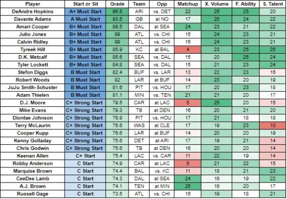 The players are sorted by grade in descending order with the highest grades at the top and the lowest at the bottom. The highest-graded players receive A+ (Must start), and the lowest receive F. However, there are varying degrees of the F grade, and some players with this grade are flex plays, desperation plays, Hail Mary plays, or should remain on your bench, depending on the grade and position.