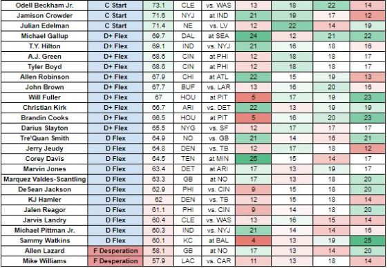 It’s more of the same for our highest-graded wideouts this week, though there are a couple of notable injuries in Davante Adams and Julio Jones, who have both missed practice time this week. D.K. Metcalf continues to see his stock rise, and are all three of the Cowboys’ wideouts set to feast in a sumptuous matchup with Seattle?